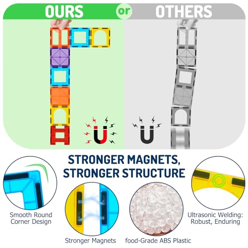Safe & Durable Kids Toys — Our magnetic tiles toys are “CPSIA” and “ASTM” certified and do not contain any harmful gases. Made of safe and durable ABS plastic with advanced ultrasonic welding technology. The smooth surface and rounded edges allow children to play safely without causing scratches or damage. This is a perfect set of toys for 3 4 5 6 7 year old
