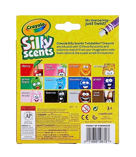 Crayola Silly Scents combines fragrant scents in a cool, colorful line of crayons, markers and colored pencils! Each aromatic art tool comes ready to scribble and sniff. The 12 pack of Mini Twistables Crayons includes Cherry, Orange, Pineapple, Apple, Beach, Blueberry, Grape, Tropical Punch, Cotton Candy, Licorice, Coconut, Root Beer. Twistables never need sharpening – just twist to advance crayon. Comes in a delightful character pack.