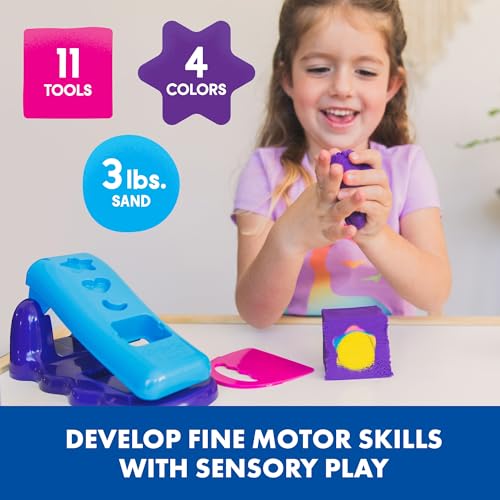 “The viral guess the color trend in a toy for creative girls and boys ages 3 and up! Create mesmerizing color reveals with soothing Playfoam Sand, the perfect learning toy for kindergarteners and preschoolers. Practice shape matching, color matching, and fine motor skills as kids create satisfying color reveals. Includes three pounds of Playfoam Sand in four colors, a design station, cylinder and cube molds, three core molds, three shaped stampers, a cutter, and a scooper.