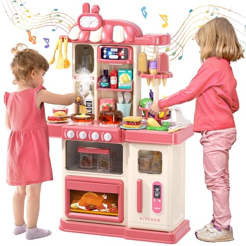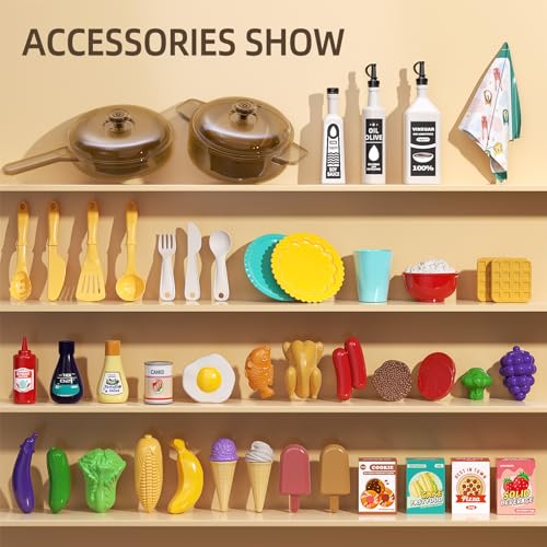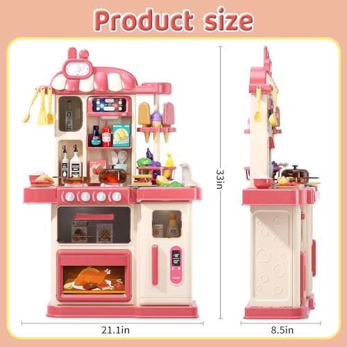 [Immersive Kitchen Play Experience] Dive into the world of cooking with this fantastic interactive toy kitchen set! Featuring a glowing electric stove, realistic cooking sounds, a running water sink, various toy foods, and kitchen accessories. Stay organized with ample storage including a refrigerator, oven and shelf.