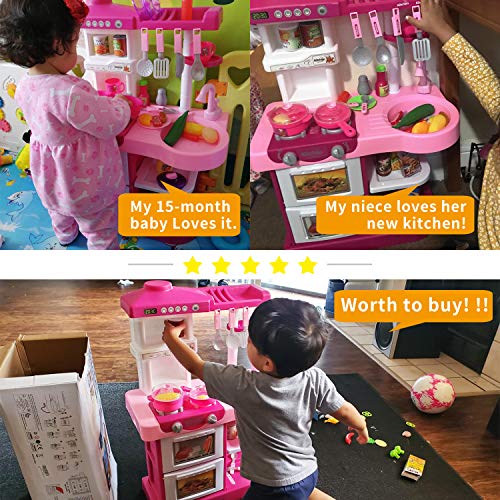 TEMI Play Kitchen Playset Pretend Food – 53 PCS Pink Kitchen Toys for Toddlers, Toy Accessories Toddler Set w/Real Sounds and Light, Toddler Outdoor Playset for Kids, Girls and Boys