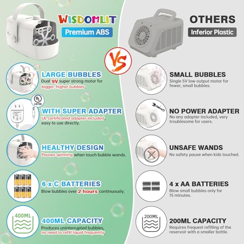 【8,000+ Colorful Bubbles Per Minute】Wisdomlit Bubble Machine with 6 Spinning Bubble Wands, 2 Speed Levels & Built-in 9,000r/min Powerful Motor. It Can Generate Over 8,000 Colorful Big Bubbles Per Minute and Blow Tons of Bubbles Richer, Higher & Farther Even Inside Without Wind.
